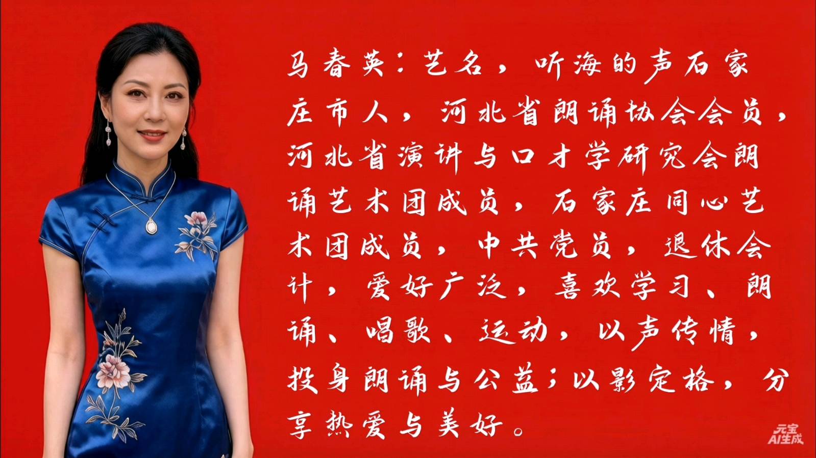 马春英 石家庄市人,河北省朗诵协会会员,河北省演讲与口才学研究会朗诵艺术团成员,石家庄同心艺术团成员,中共党员,退休会计,爱好广泛,喜欢学习、朗诵、唱歌、运动,以声传情,投身朗诵与公益;以影定格,分享热爱与美好。