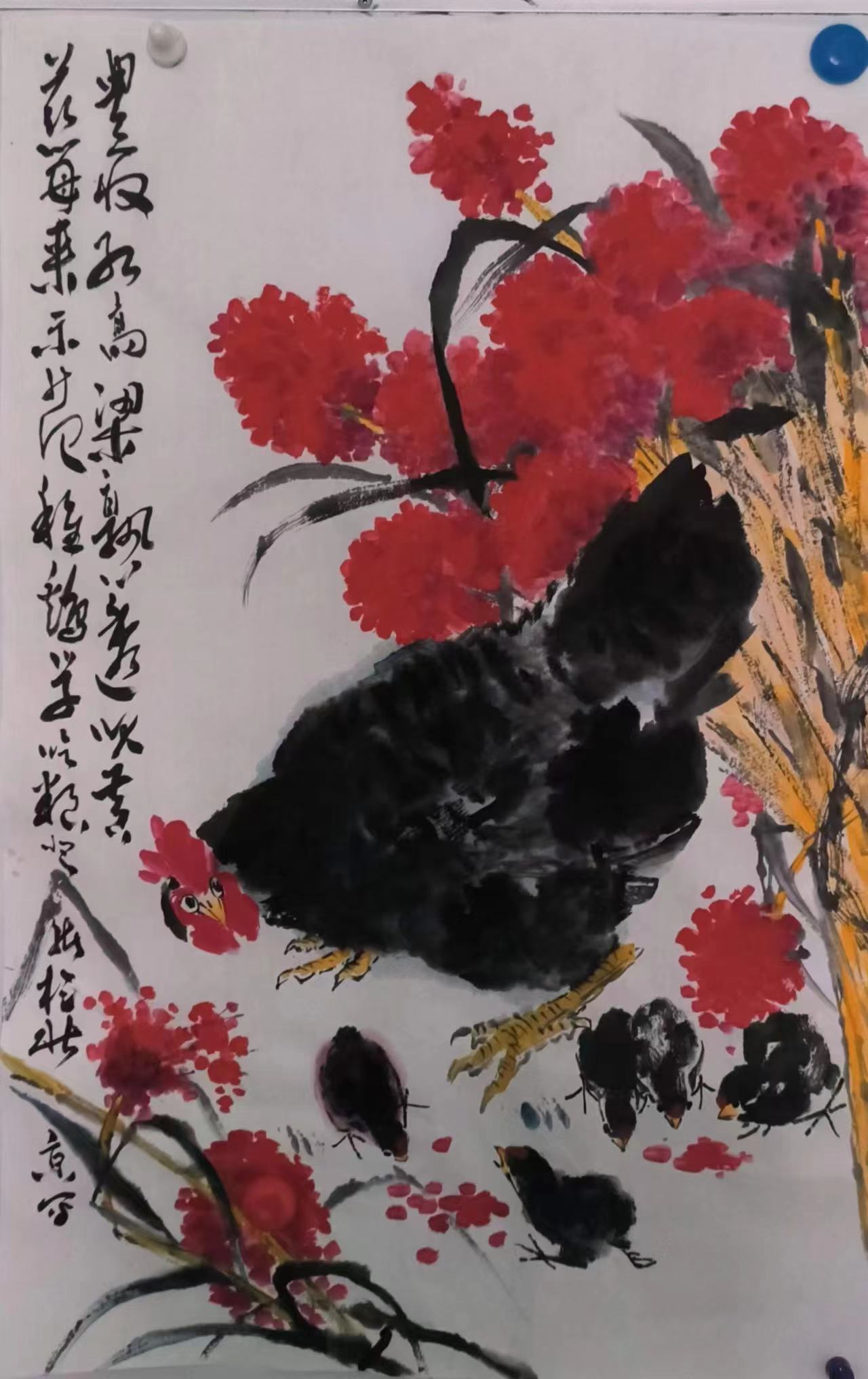 如《五福同寿》以朱砂点染寿桃,浓淡积墨写桃枝,墨色与朱砂相映,喜庆而雅致;《荷塘清韵》以赭石花青调和的“混沌色”破淡墨荷叶,表现晨雾朦胧,清新空灵。该技法既保留水墨韵味,又增添色彩鲜活,契合当代人对丰富视觉效果的审美需求。