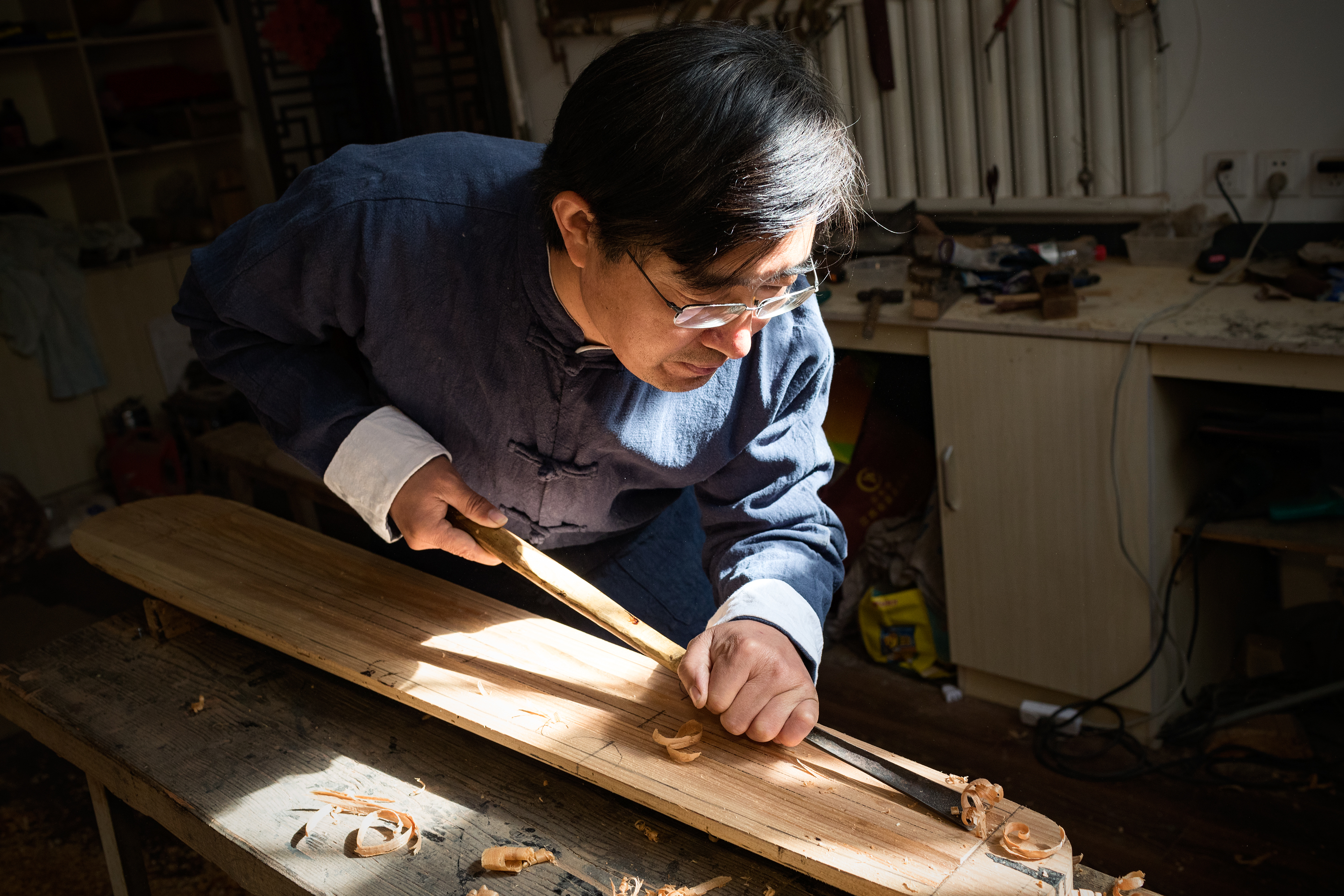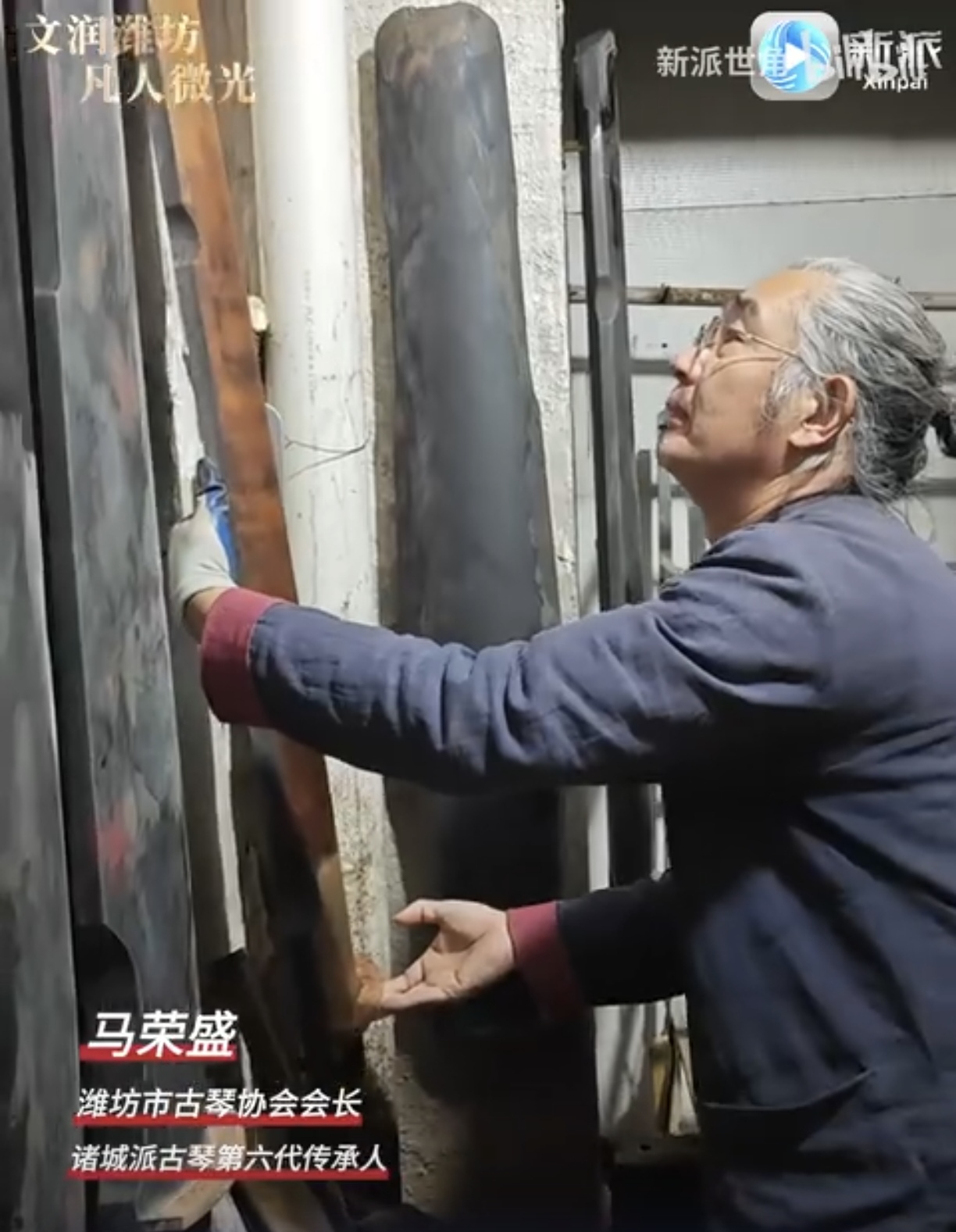 斫琴自古便是“一年斫琴,三年调音”的苦差事,上百道工序,无一不考验着匠人的耐心、匠心与定力。马荣盛恪守古法斫琴,近三十载时光始终如一,从未有半分懈怠。选材之时,他极尽严苛,只寻历经百年岁月沉淀的老桐、老杉为料,唯有木性温润、质地紧实的木料,方能孕育出古琴独有的苍古通透之音;从制坯、挖槽、上灰胎,到反复打磨、安岳、上弦、精细调音,每一道工序他都亲力亲为,精益求精。他不尚浮华,不逐功利,斫琴从不追求形制花哨繁复,唯重音色气韵与琴魂内核,经他之手诞生的古琴,形制中正儒雅,音色苍古温润、松透醇厚,余韵悠长,静听琴音,如临松风涧泉,尽显诸城派古琴的厚重风骨与中正气度。每一张琴,都要历经两三年时光的细细打磨、慢慢滋养,琴身之上,刻下的是他对传统技艺的敬畏,藏着的是他对琴道的极致追求。缓步案前,他轻抚亲手斫制的古琴,眼中满是温柔与珍视,他常说,斫琴亦是修心,每一张琴都有独属于自己的灵魂,需以诚心相待,以耐心雕琢,正如做人,沉下心来,方能成就佳品。轻拨琴弦,低沉醇厚的琴音缓缓流淌,没有炫技的花哨,唯有直击人心的沉静力量,让人瞬间褪去浮躁,仿佛穿越千年时光,置身于古人抚琴吟诗的雅致意境之中。