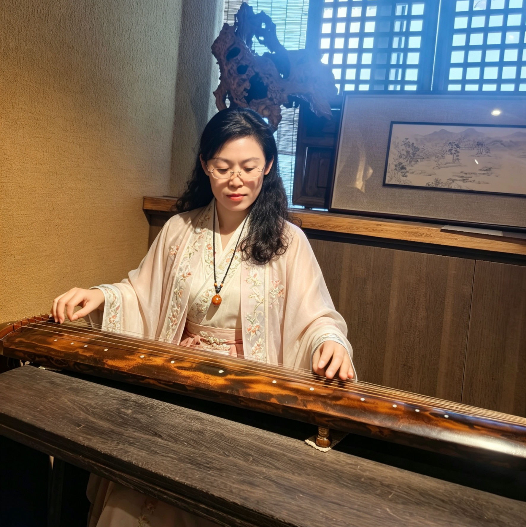 夫人黄建美,是马荣盛琴艺路上最默契的知己,更是他古琴普及传承路上最坚定的同行者。身为中国琴会会员、中国音乐学院认证古琴教师、潍坊市古琴协会理事,同时也是大拙琴韵的核心主讲与负责人,黄建美自幼浸润于传统文化,酷爱音乐与书画,自与古琴结缘后,便一心深耕琴艺。她同样师从朱子易先生,更得姜抗生、李天桓等多位琴界名家悉心指点,博采众长,练就了精湛纯熟的琴艺。