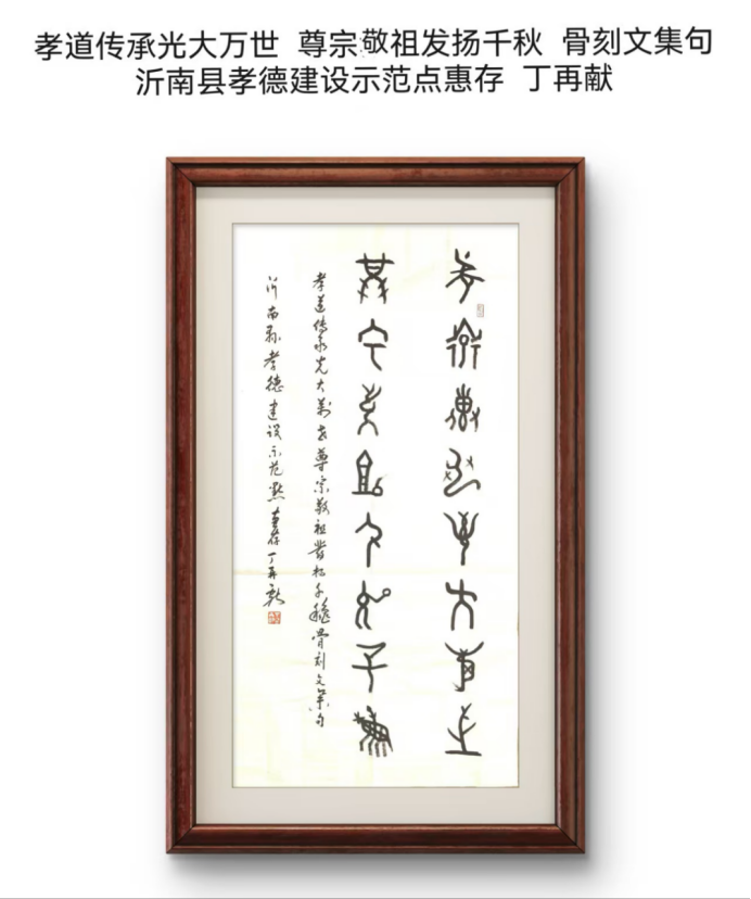 一、溯源寻根:骨刻文脉 古墨新声丁再献集字所用的东夷骨刻文,比甲骨文还早约1300年,是汉字的源头之一。他从仅破译的900余字中“淘金”,让这些曾刻于兽骨、沉寂数千年的符号,通过毛笔在宣纸上“复活”。这副对联的独特价值在于“以古述今”——用最古老的文字书写最恒久的价值观(孝与仁),实现了文明源头与道德源头的同频共振。这不仅是书法展示,更是将“孝德”的根脉深植于中华文明的最底层土壤中,赋予了示范点建设以厚重的历史纵深感。