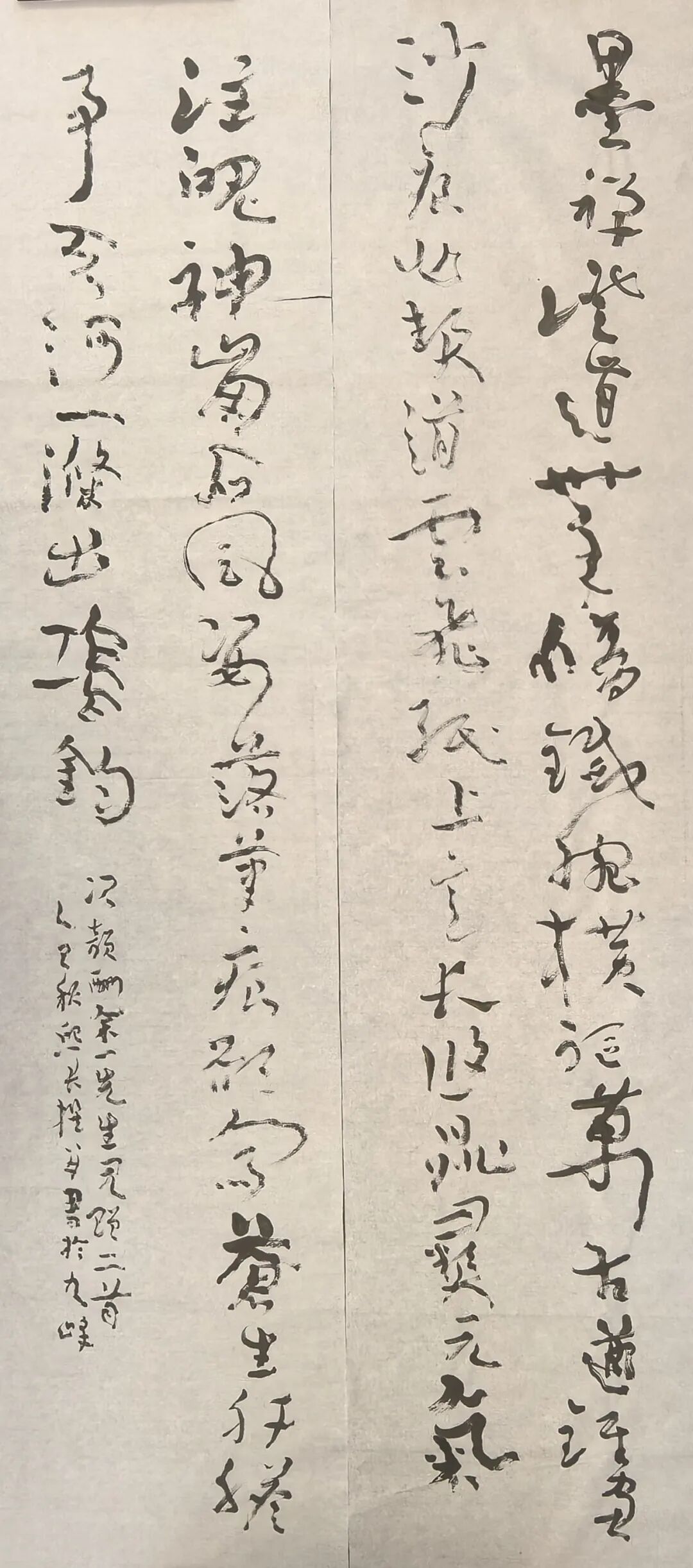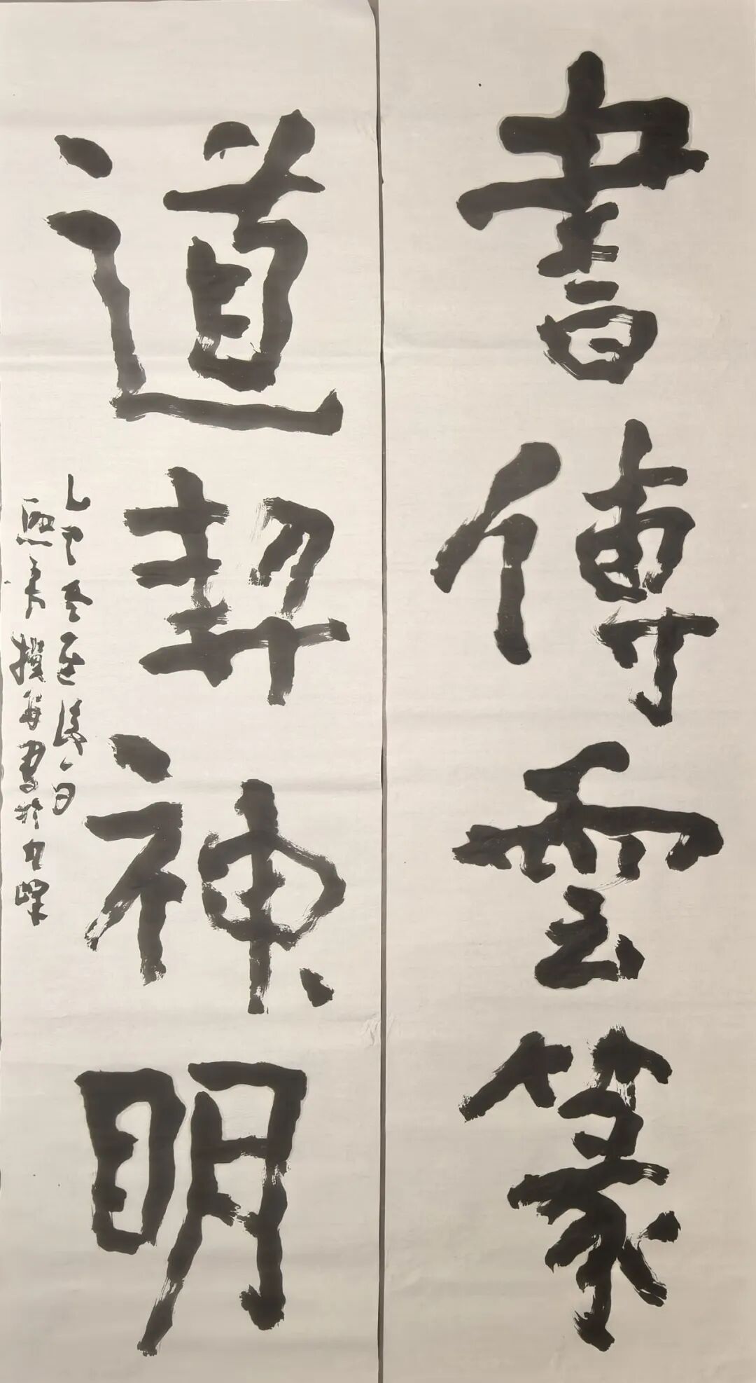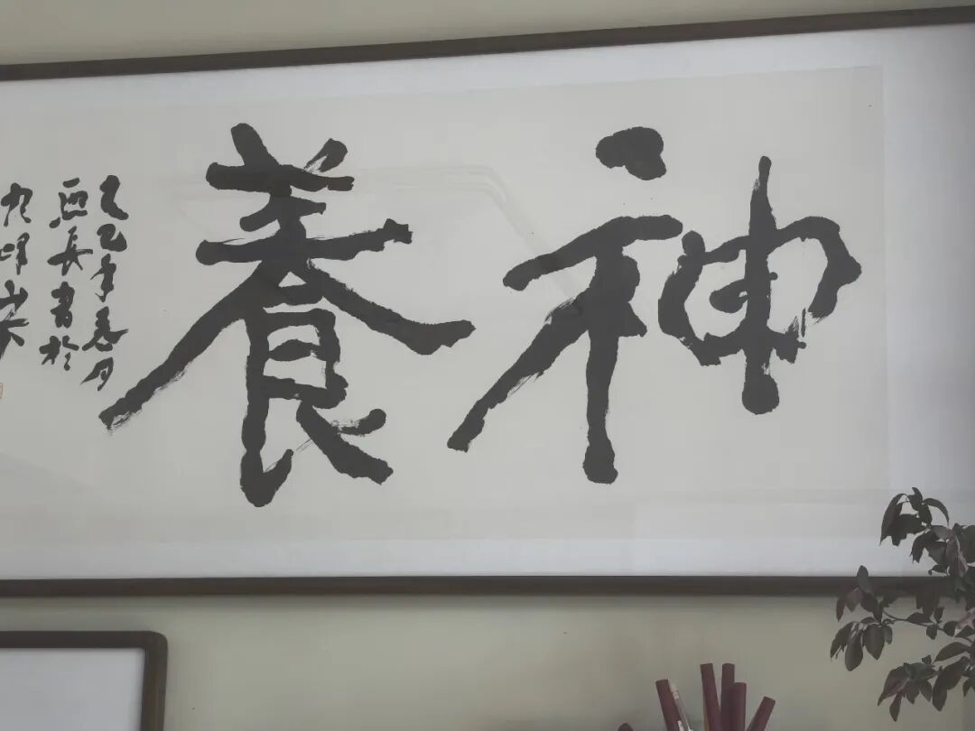 谈话间,茶已续了两泡。先生忽然起身,走到墙边一幅墨迹未干的字前。那是一幅榜书大字《神养》,道风如《瘗鹤铭》,仙骨似《许长史》,墨色饱满处如山岳吞烟,飞白处如云海卷舒。他指着那字,却不说什么笔法、结构,只说:“你站在这里,心里感觉怎样?”