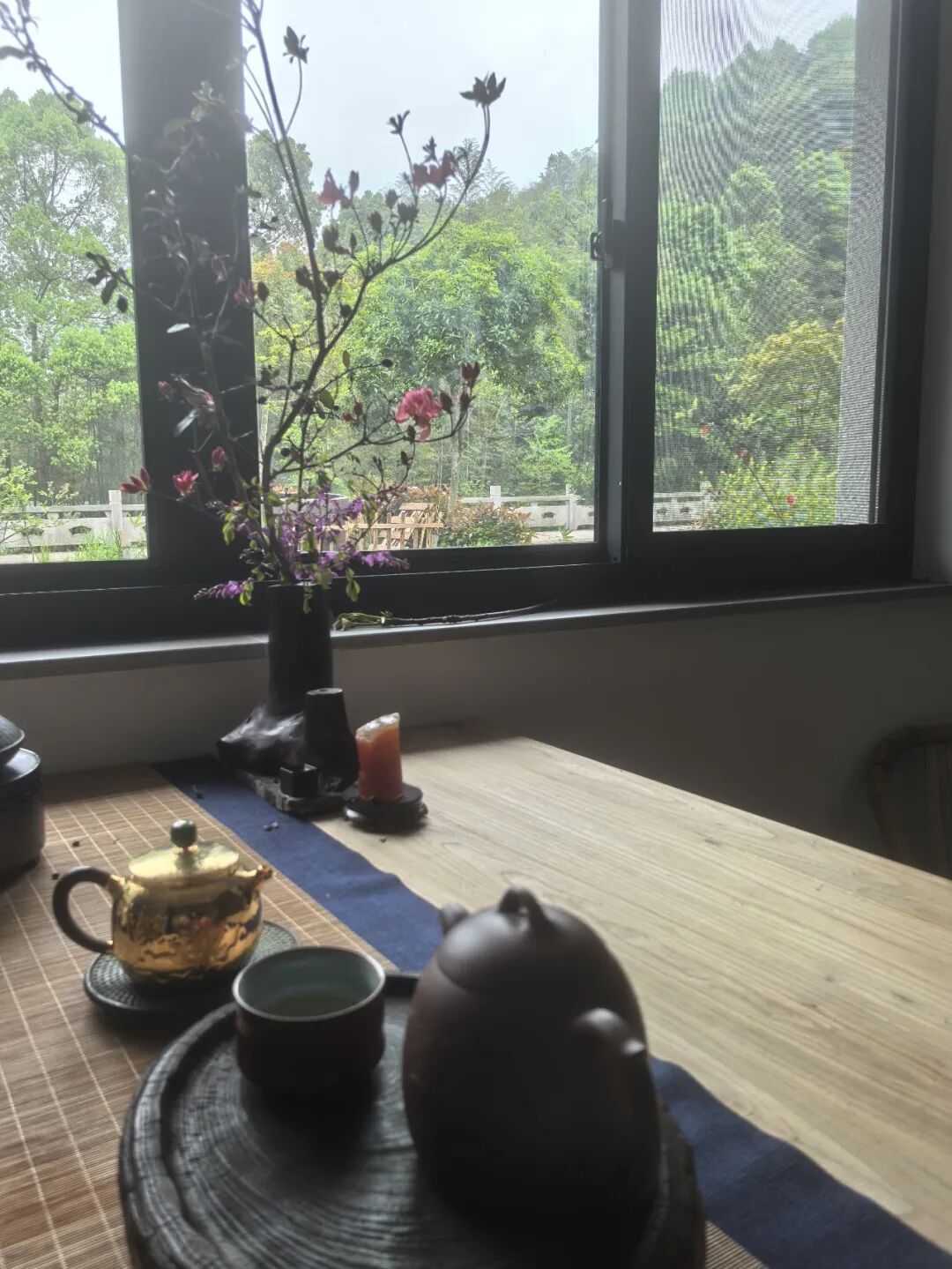 进入先生茶室,听见水壶在炉上轻响,一缕茶香已袅袅飘来。茶台一侧的紫檀香炉已燃着檀香,靠窗边有一盆插花,一看就知道采于山中溪旁,整体素色,君枝斜于茶桌,雅中有奇。我想先生插花,非为闲赏,而是以花喻洁,以静守志。此时,溪边的鸟声时时传入室内,好似“花笑似留客,鸟啼如唤人!”正凝神间,一阵轻缓的脚步声从屋内传来——先生已迎了出来。