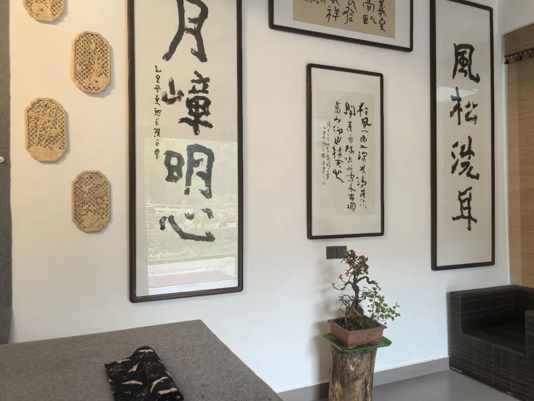 先生见我盯着那幅书作,便告诉我:去年初冬从黄岩迁来此处住的当天傍晚,他独自坐在这窗边饮茶,看着远处山色,饮松风如饮好茶,当下提笔即兴书之。