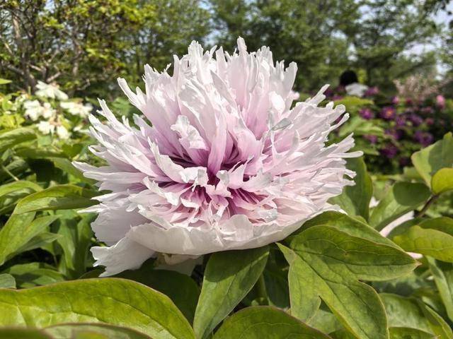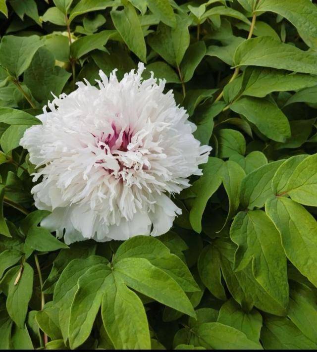 6、‘程门立雪’(可称‘雪丝贯顶’)。花白色,托桂型或皇冠型。外瓣2-3轮,宽大平展,洁白;内瓣细碎如银丝状,花瓣基部有紫晕,部分雄蕊散布在卷曲的细碎花瓣上;雌蕊正常,房衣紫色,柱头紫红色。和网红牡丹品种‘银丝贯顶’的区别是:花期特晚可达“五一劳动节”前后,花朵直径比‘银丝贯顶’大,花瓣的基部紫晕比‘银丝贯顶’更紫更艳。花期特晚。洛阳二乔牡丹园程彦林育出。