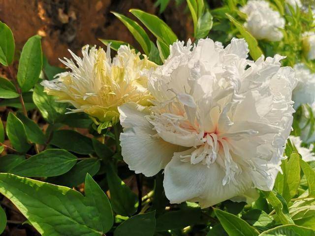 西北牡丹品种群中,内瓣细丝条状花型的品种较多,比如‘剪春萝’‘狮子王’‘玉狮子’‘粉狮子’‘墨狮子’‘新白玉狮子’‘雪青狮子’‘菊花白’‘菊花黄’‘菊花蓝’‘白燕尾’‘燕尾白’‘白浪’‘九子菊’等。