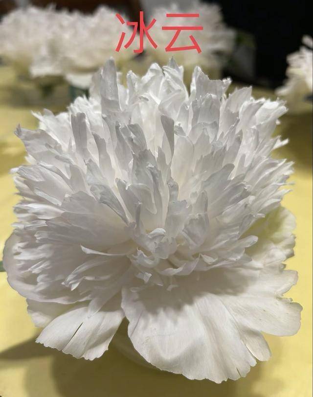 7、‘冰云’(可称‘冰丝贯顶’)。花纯白色,皇冠型。外瓣1-2轮,宽大平展,有齿裂;内瓣窄长如银丝状,全花洁白,晶莹剔透。花期晚。洛阳二乔牡丹园程彦林育出。