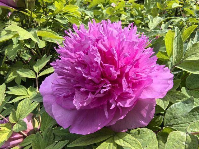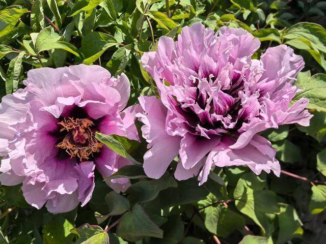 11、‘粉丝贯顶’(品种名‘紫羽傲阳’)。花粉紫色,皇冠型至绣球型。花大,外瓣2-4轮,瓣基有墨紫斑,内瓣细长而质软,端部剪裂,常残留花药。花期晚。菏泽百花园育出。
