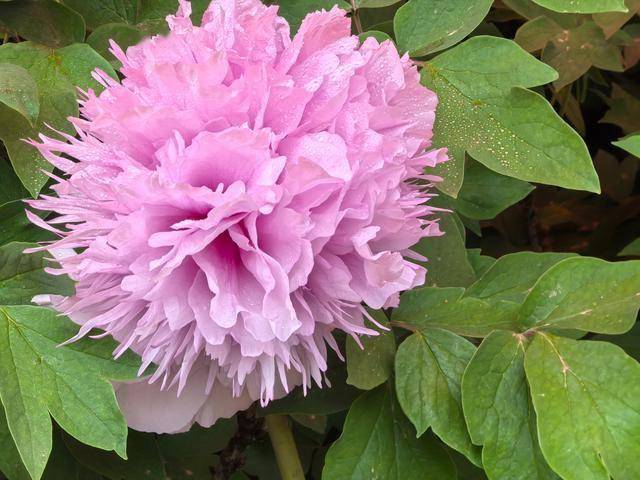 9、‘斗珠’(可称‘粉丝贯顶’)。花粉色,稍带蓝,皇冠型。外瓣2-3轮宽大,瓣间有紫色纹。内瓣稠密,齿裂明显,呈细碎针丝状。花期晚。传统牡丹品种。