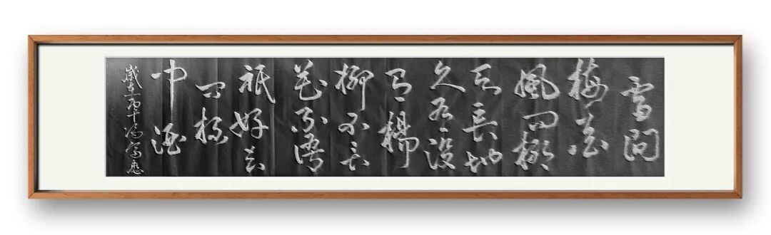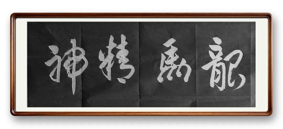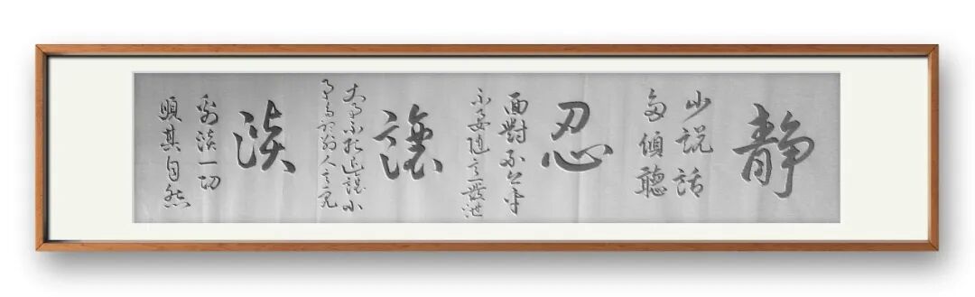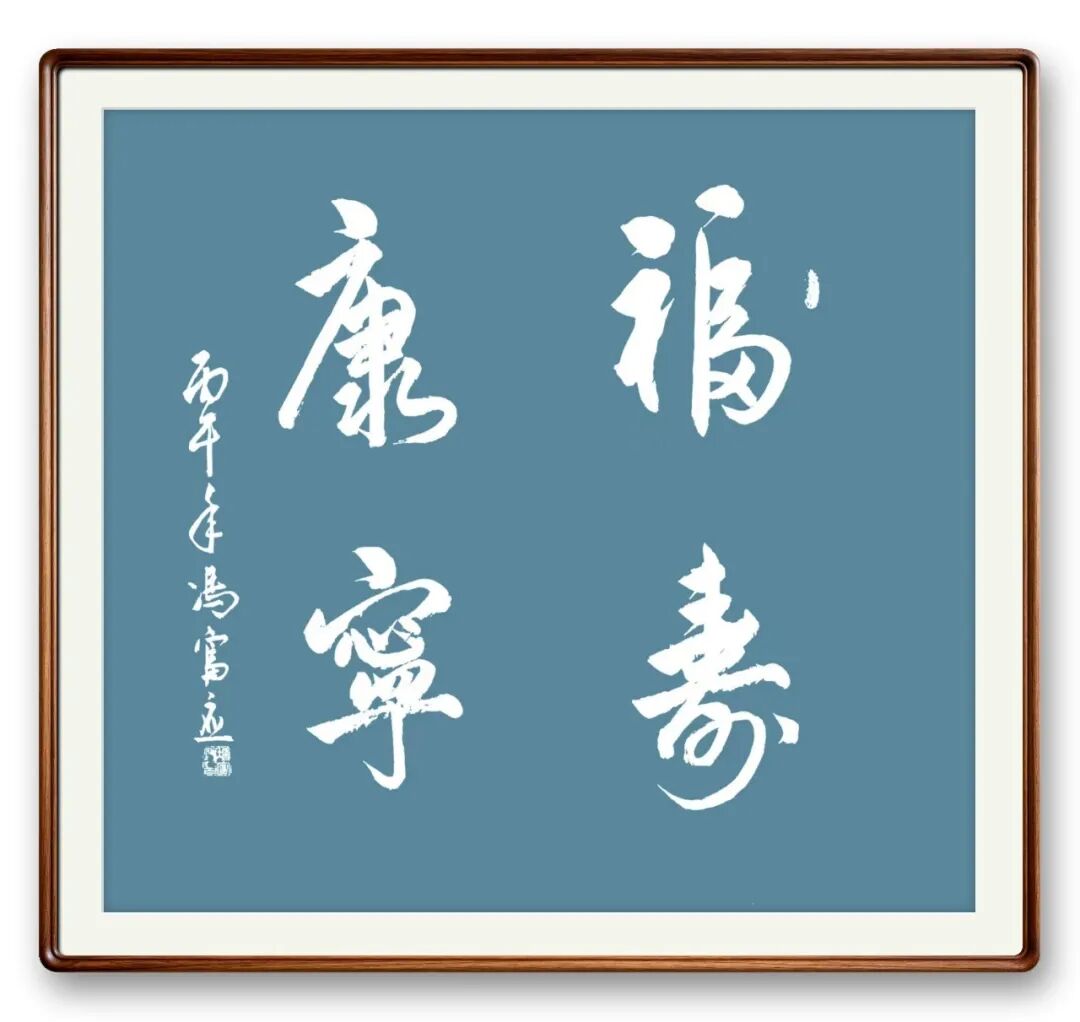 冯富应的榜书,更见胸襟气魄。落笔沉雄有力,结体开张大气,字字挺拔雄健,气象正大恢弘。大字之中见精微,雄浑之间含静气,既具楷书的坚实骨架,又兼行书的灵动神采,墨色苍厚,力透纸背,尽显传统榜书的正大气象,亦展露书者豁达开阔的胸襟。