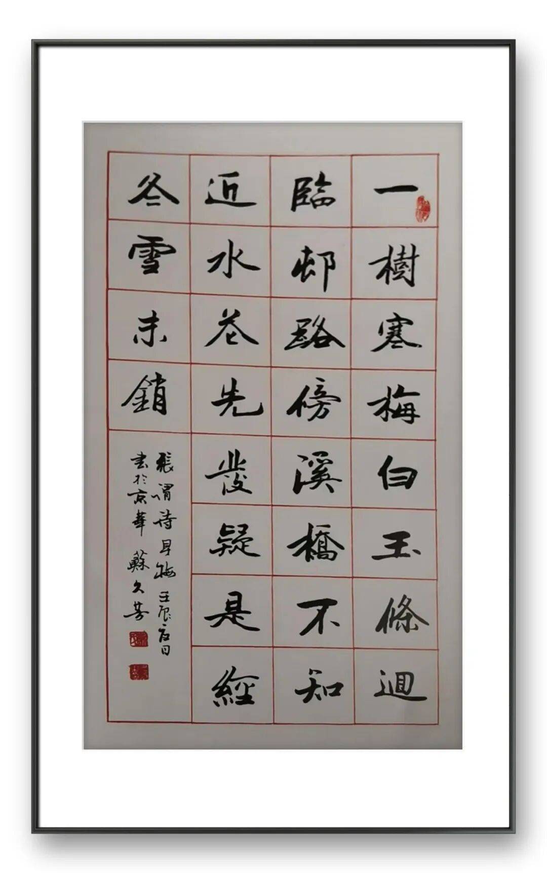 禅与书法,本就同源共生,禅家的 “明心见性” 与书法的 “书为心画”,在先生的作品中实现了完美融合。观其作品,无论是洒金笺上的行草,还是方格中的楷书,皆无浮躁之气,笔墨间尽显空灵淡远的禅意。笔墨简淡悠远,结体疏朗通透,章法虚实相生,将诗中的禅意与书法的墨韵融为一体,让人观之忘俗,心生宁静。先生以禅入书,将修行中的静定、通透、淡然融入笔墨,使书法不再是简单的技艺展现,而是心性的自然流露,是禅理的笔墨诠释,达到了 “书禅一味” 的至高境界。