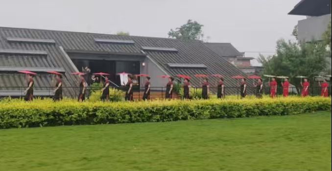 雨过天晴,晨光穿透薄雾,倾洒在汉阳院子的每一处角落。西侧院墙之上,玫瑰肆意绽放,繁花似锦,与院内葱郁的草坪相映成趣;蜿蜒四五百米的Z字型走秀台,静静铺展在满园春色之中,中央舞台矗立其间,处处皆是诗情画意。此刻,岷江河岸的山峦被薰色霞光笼罩,若隐若现,宛若仙境,为这场盛会铺垫下最温柔的底色。青神县青衣文化艺术团、汉阳旗袍队、乐山阿热婼妞走秀队的姐妹们,身着华服,怀揣热忱,齐聚于此,一场别开生面的联谊走秀活动,在这片山水间缓缓拉开帷幕。