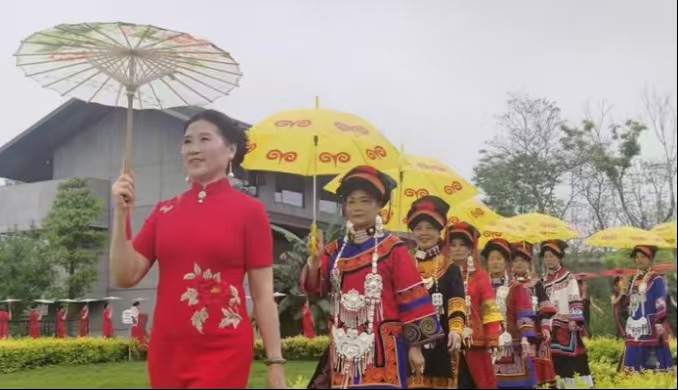 歌声落幕,Z字型走秀台上,风华尽显。乐山阿热婼妞走秀队走秀队的姐妹们,身着精美的彝族服饰,斑斓的彝绣、灵动的银饰,伴着步履轻摇,叮咚作响,尽显彝族儿女的婀娜多姿,将小凉山的民族风情演绎得淋漓尽致;青神青衣艺术团的姐妹们一袭红裙,鲜艳夺目,似春日里最炽热的霞光,步履间满是自信与昂扬;汉阳古镇旗袍队的姐妹们,身着典雅黑色旗袍,温婉清丽,一颦一笑尽显东方古韵,举手投足皆是岁月静好。