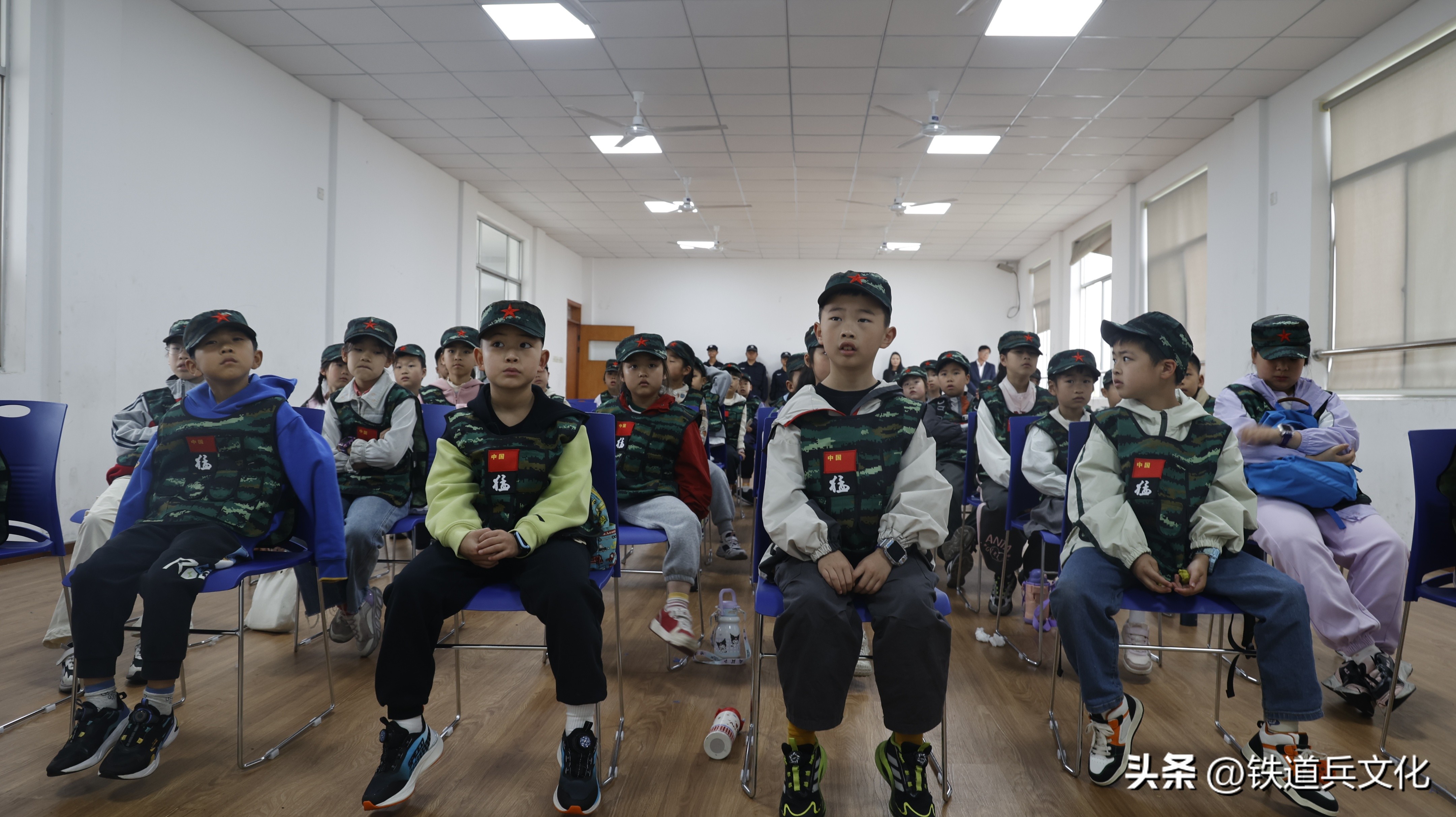 身着迷彩马甲、头戴红星小军帽的小记者们在教室听课
