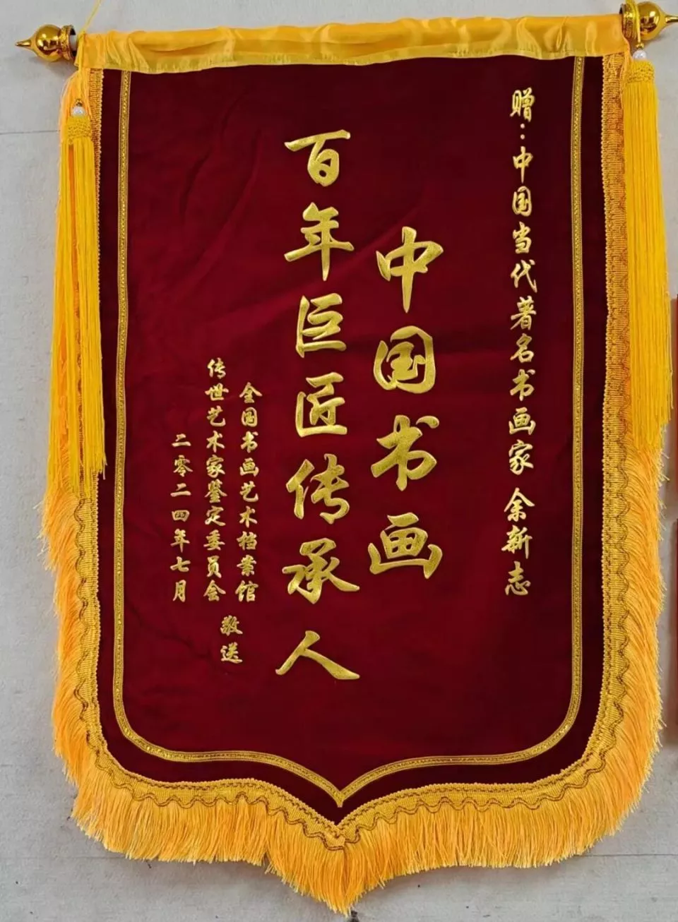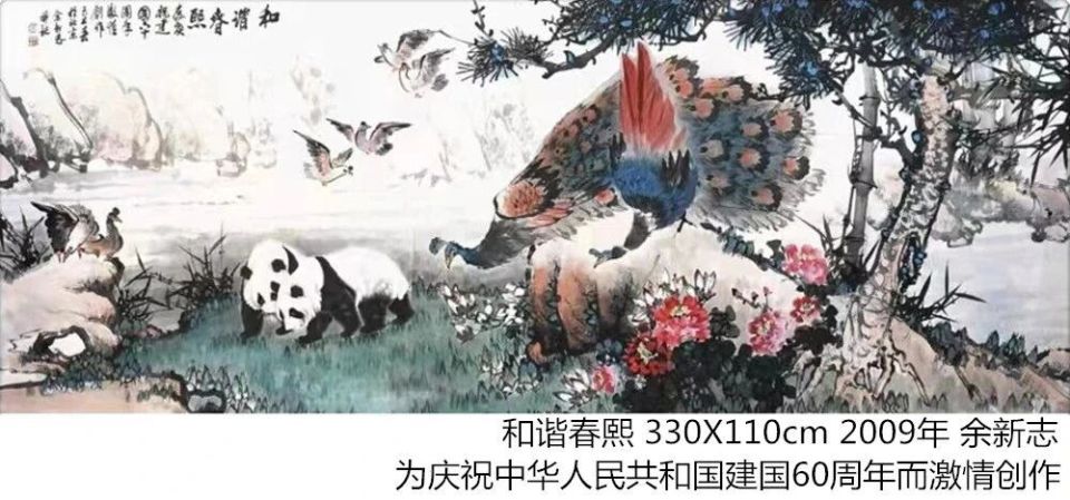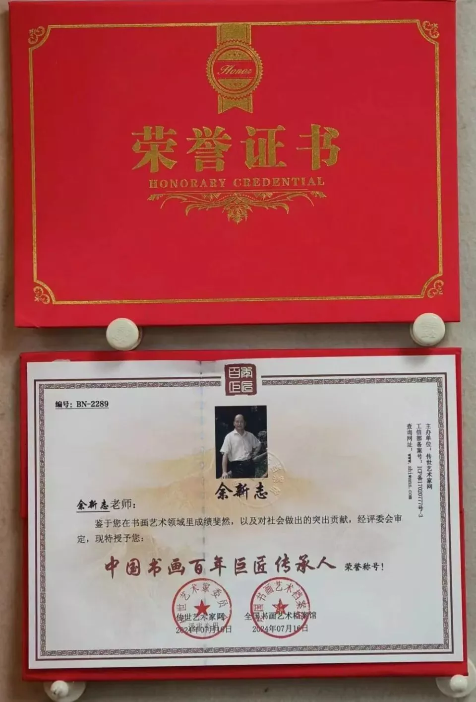 1989 年就在中国美术馆成功举办个人书画展,声震画坛, 享誉海内外。2007 年应邀参加外蒙古国“纪念成吉思汗成 立 800 周年”大型活动,被授予“成吉思汗”荣誉勋章;2010 年被世界华人华侨总会评为“世界华人精英优秀人物”和“世 界华人杰出艺术家”;2011 年被国家授予“共和国杰出书画 家”勋章;2014 年被授予“全国‘五·一’劳模”勋章;2015 年被评为“非物质文化遗产传承人物”,授予“一代宗师” 荣誉称号。2017 年在美国洛杉矶举办画展,受邀走进联合 国会议大厅参加高峰论坛会,受到布鲁斯·罗茨主席的亲切 接并合影留念。2021 年余新志先生与张大千、林散之、李苦禅、林凤眠、启功、李可染、欧阳中石、黄永玉、沈鹏等 顶尖级艺术家被评为“艺术百年·新中国十大巅峰艺术家”。同年11月,余新志被联合国教科文组织授予“联合国文艺宣传大使”,并颁发了“大国荣誉金杯奖”。2025年,余新志又被联合国教科文组织聘为名誉主席,并颁发了聘书。