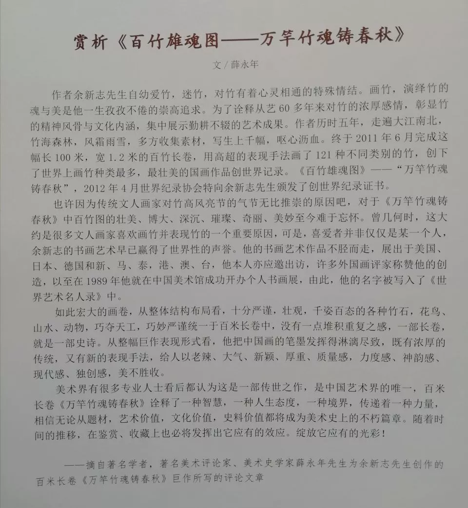 中国著名学者,中国著名美术史家、评论家薛永年对此专门撰文认为: 《万竿竹魂铸春秋》运用多元化绘画技法,高超的艺术表现能力,笔墨酣畅,挥洒淋漓,把各种奇竹、花鸟、动物、山水表现得神韵十足,尽善尽美。画中自然、人文意境,原始拙朴,纯净雅致有机事例,营造了至真至美至和的崇高艺术境界。使观赏者才进入无限遐想,油然而生,心游物外的惬意享受,使心灵得到了滋养,精神得到了升华。百竹图,是艺术家精神与人格的最好写照与延伸。