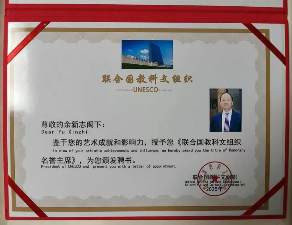 余新志以艺为媒,传递中国声音、讲述中国故事,让中华文脉在全球范围内绽放光彩,用坚守与担当,诠释了艺苑泰斗的家国情怀与全球视野,为推动世界文化多样性发展书写了浓墨重彩的一笔。
