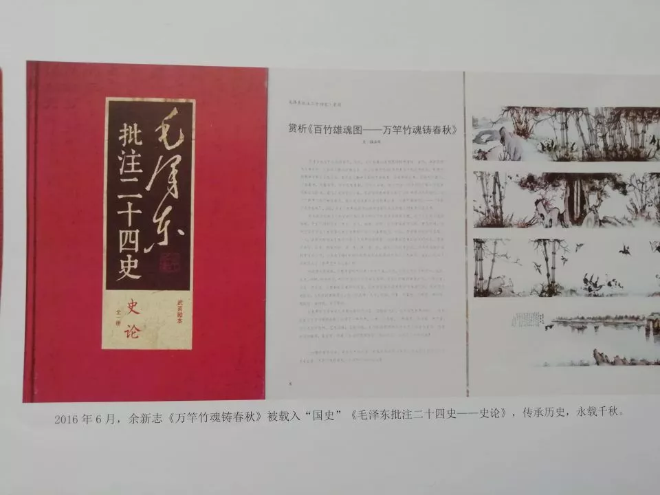 2011年6月,国画大师余新志老师历时5年完成了一幅幅长100米,宽1.2米的百竹长卷,用高超的表现手法画了112种不同类别的竹子,创下了世界上画竹种类最多,最壮美的国画作品创世界记录。《百竹雄魂图》——“万竿竹魂铸春秋”,2012年4月被世界纪录协会向余新志先生颁发了创世界纪录证书。