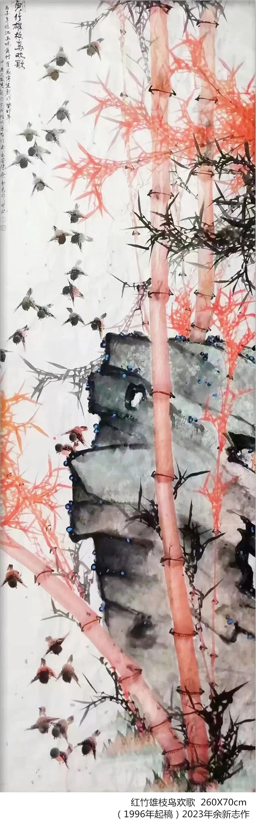 余老先生几十年来,走遍大江南北,全身心投入竹画写生创 作,收集素材数千幅,终于在 2012 年创作完成了长 103 米、宽 1.2 米的百米长卷《百竹雄魂图——万竿竹魂铸春 秋》,创下“画竹种类最多、最美的百米长卷”世界纪录,传承千秋。2016 年百米长卷又被载入《中国国史》,为世人留下了不朽的竹画史料、宝贵财富,永载史册。2024 年经国家艺术档案馆严格审评授予余新志为《中国四大国粹传承人》,并颁发荣誉证书。2024 年7月授予《中国书画百年巨匠传人》颁发荣誉锦旗、荣誉证书。2024年余新志的作品被特邀精选载入巜世界美术教育史》书,全球发行后,深受赞誉!从 1993 年以来, 中国邮政总局先后为余新志先生出版珍藏纪念邮票三十余 套,全球发行,传播文化。并先后出版发行余新志个人专著 画集数百套。上百幅作品被国家博物馆、中国美术馆等国内外几百家艺术藏馆永久收藏陈列。其个人传略被载入《中国人物年鉴》《中国国史》《中国历代美术家名人大辞典》《世界人物辞海》等百余部辞书。余新志先生倾尽毕生心血,为弘扬中华民族优秀的传统文化作出了杰出贡献。