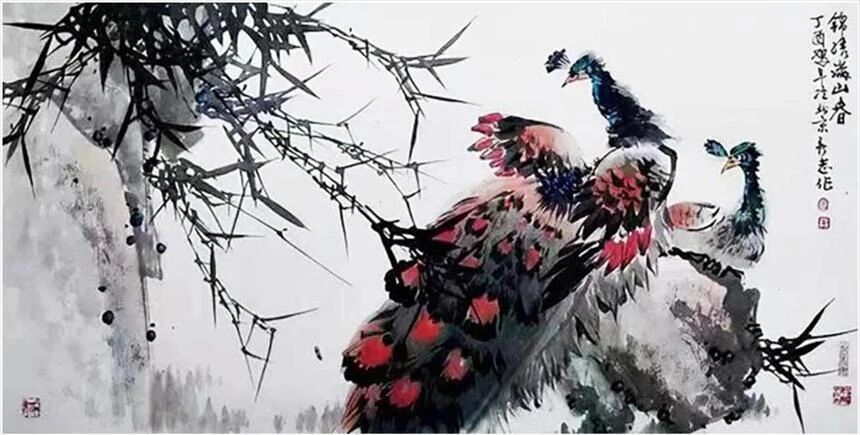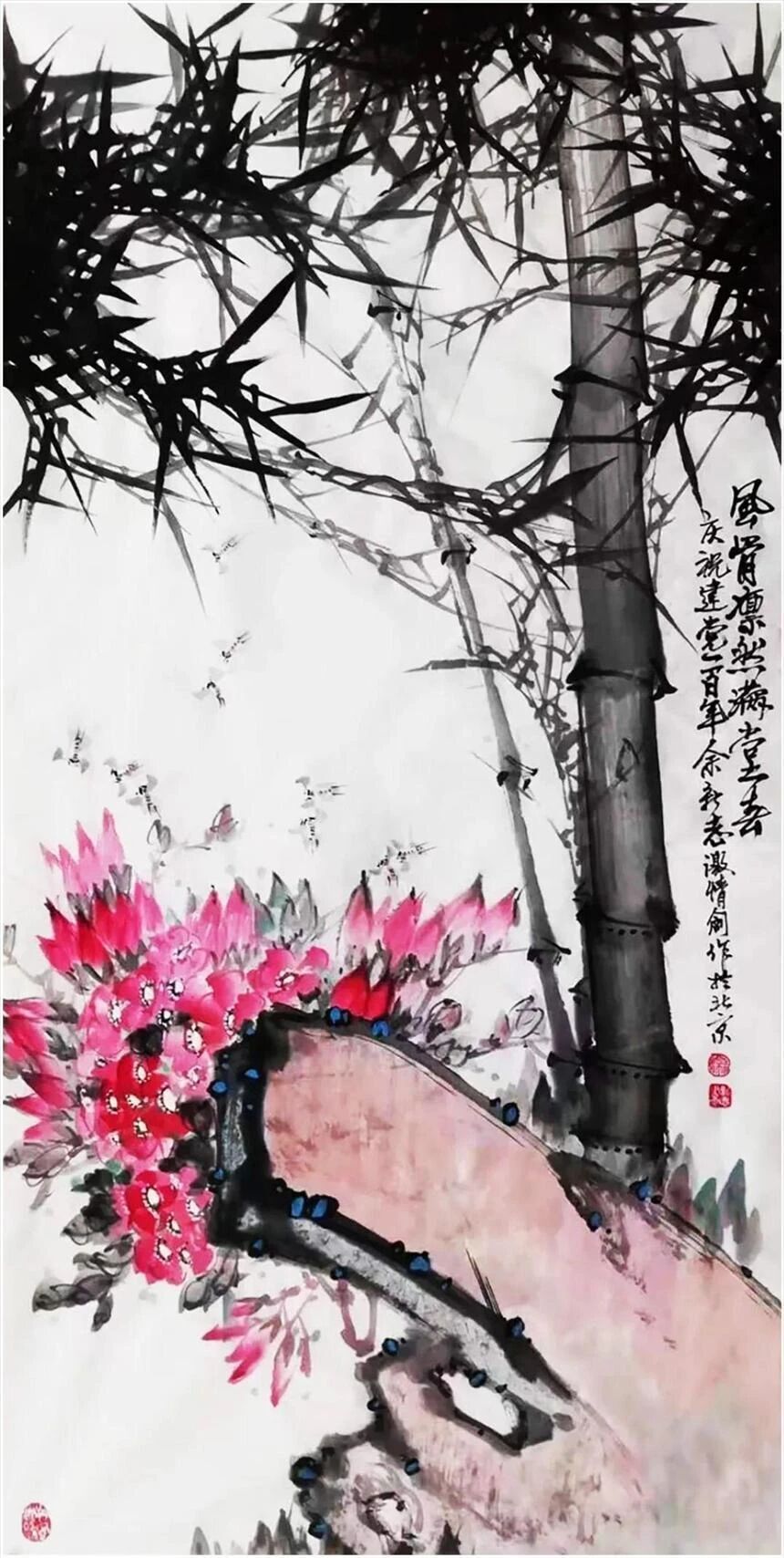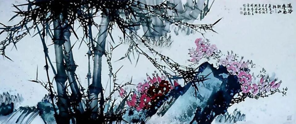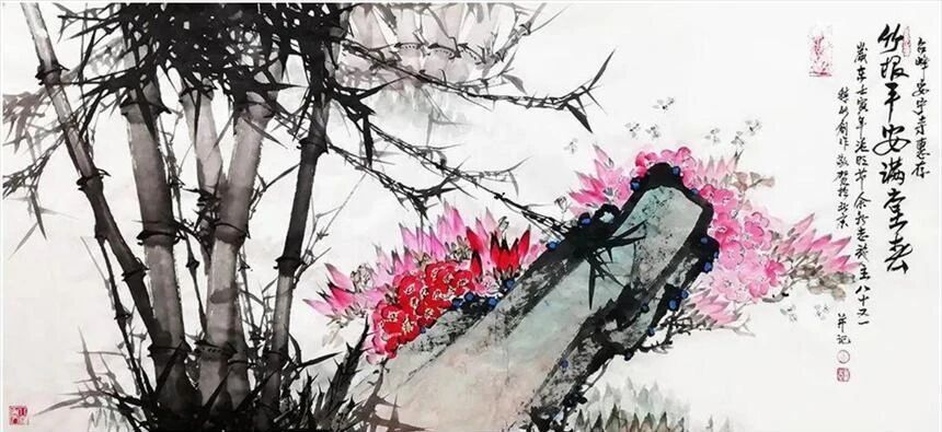 如此宏大的画卷,从整体结构布局看,十分严谨,壮观,千姿百态的各种竹石,花鸟、山水、动物,巧夺天工,巧妙严谨统一于百米长卷中,没有一点堆积重复之感,一部长卷,就是一部史诗、从整幅巨作表现形式看,他把中国画的笔墨发挥得淋漓尽致,既有浓厚的传统,又有新的表现手法,给人以老辣、大气,新颖、厚重、质量感。力度感、神韵感、现代感,独创感,美不胜收。