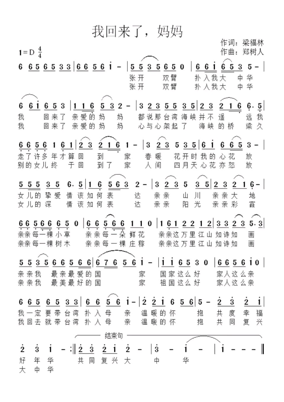 歌曲以“女儿”归家的视角展开——张开双臂,扑入大中华怀抱,一声“亲爱的妈妈”道尽漫长分离后的思念与重逢之喜。歌词中既有“台湾海峡并不遥远”的地理写实,更升华为“心与心架起桥梁”的情感写意。通过亲亲山川大地、阳光彩霞、草木鲜花等细腻意象,层层递进地抒发对祖国万里江山如诗如画的挚爱。