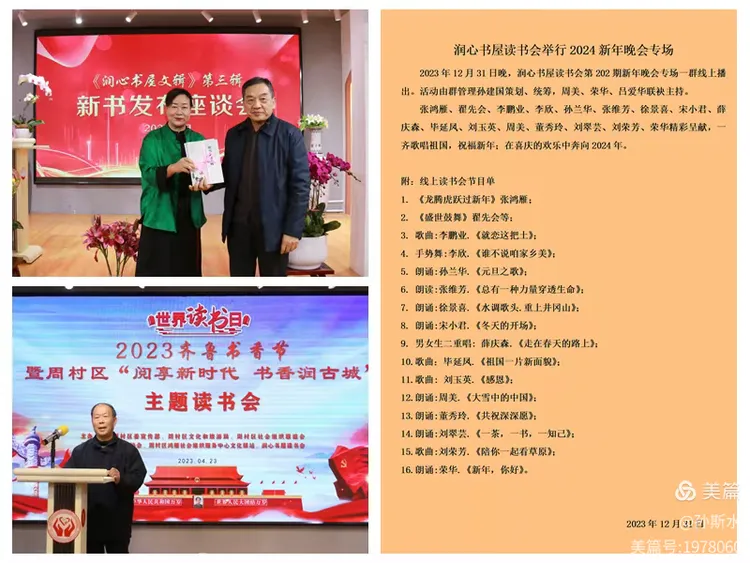线上线下联动,让读书成为日常 以太和南小区“润心书屋”为固定阵地,推出返乡大学生读书会、周三固定读书会、二十四节气沙龙、12花神雅集等特色活动,一年举办近百场阅读活动;疫情期间,更是搭建起两个千人线上共读群,用琅琅书声筑起精神防线,书友群体从周村延伸至全国,至今仍每日共读。