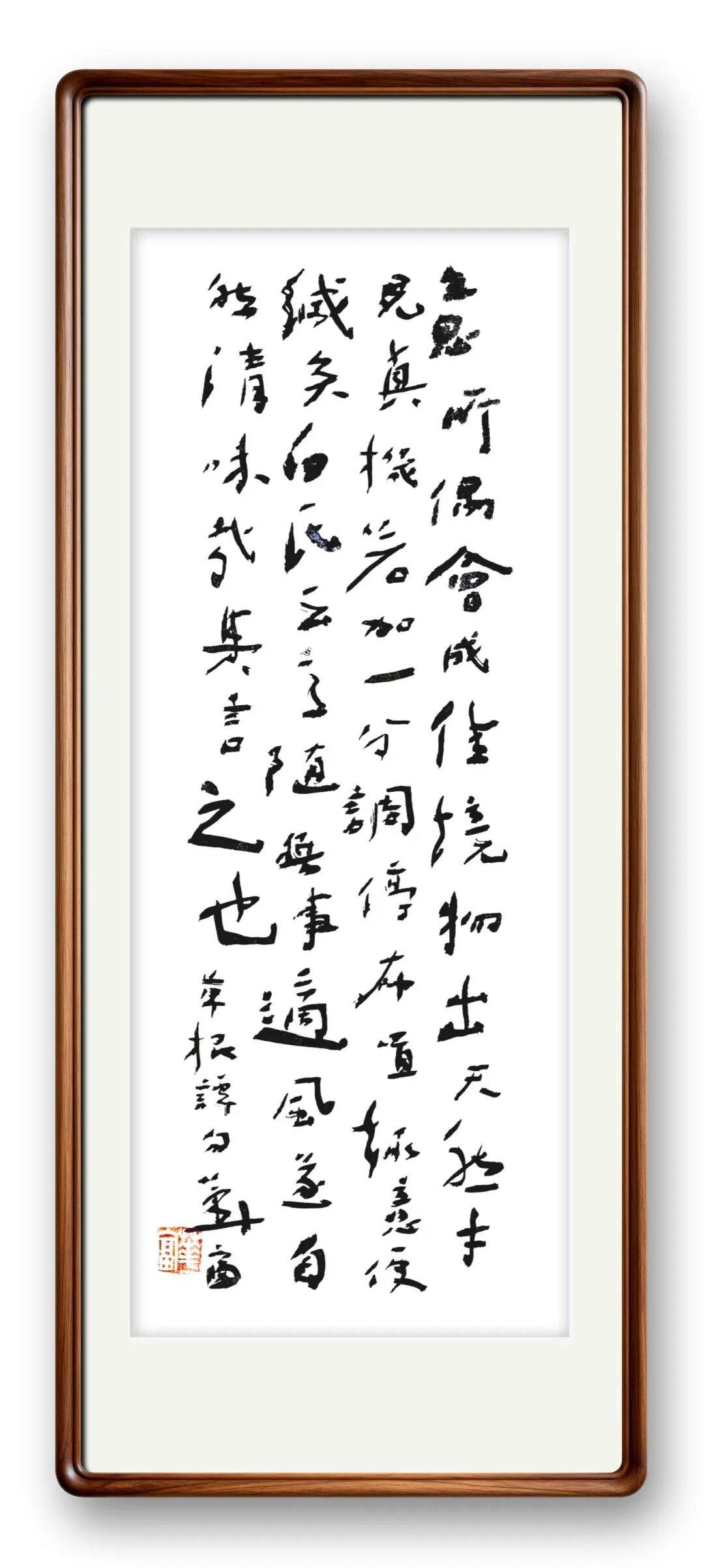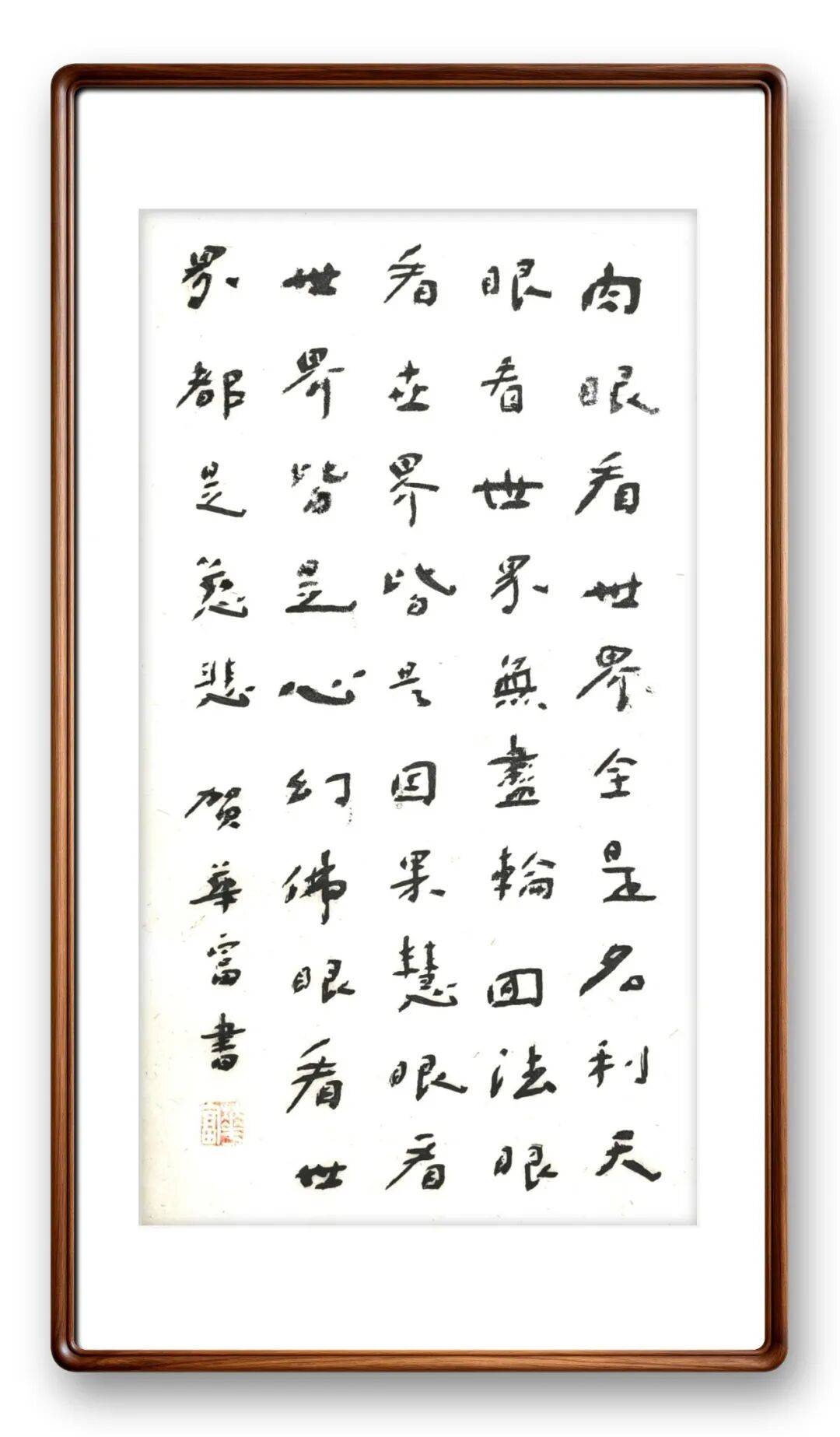 五十余载的勤习苦练,让贺华富先生的书法技艺日益精湛,最终独辟蹊径,自成一体。他的行草作品,既不失传统技法的严谨与厚重,又充满了鲜明的创新精神,形成了“灵动而不浮滑、雄浑而不笨拙、飘逸而不松散”的独特风格。观其行草作品,笔墨灵动流畅,线条富有张力,或如“屋漏痕”般自然沉稳,或如“锥画沙”般圆润浑厚,或如“折钗股”般挺拔遒劲,每一笔都力透纸背,每一字都神采飞扬。结体上,他巧妙处理偏旁揖让、疏密对比、欹正关系,做到险而不怪、奇而有致,严整中见灵动,变化中求统一;章法上,他融合“计白当黑”的传统理念与现代审美意识,作品或疏朗开阔,或茂密紧凑,首尾呼应,气脉贯通,给人以强烈的视觉冲击力与艺术感染力。