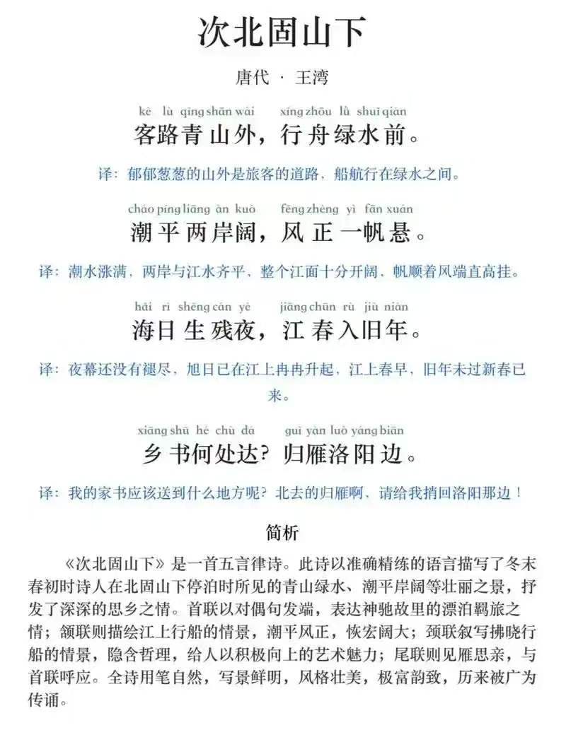“乡书何处达?归雁洛阳边。”北固山地处如今江苏镇江,紧靠长江水岸,山势临江而立。古诗里有一个常考知识点,次在古文中特指停泊、停靠。题目直接交代全诗背景,诗人坐船远行,停靠山脚,身在旅途,心有感慨。