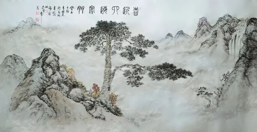 李拾磊的山水画,气象正大、笔墨沉稳,最能体现其胸襟格局。代表作《江山如此多娇之长城图》,不以险绝造势,而以雄浑立骨。长城蜿蜒于群山之间,山势厚重稳健,林木苍劲有序,全画不靠浓艳色彩夺人,只以水墨浓淡拉开层次,近处山石扎实沉厚,远处峰峦淡远朦胧。云气不勾不描,全凭留白自然生发,使得整幅画面气脉流动、开合有度,既有家国山河的壮阔气象,又有文人山水的静穆诗意。另一幅《迎客松之喜迎四海宾朋》,松干挺拔苍劲,松针层次分明,山势环抱而不压抑,既有迎宾之礼,又有山水之雅,笔墨干净通透,格调端庄大气,观之令人心胸开阔、神清气爽。