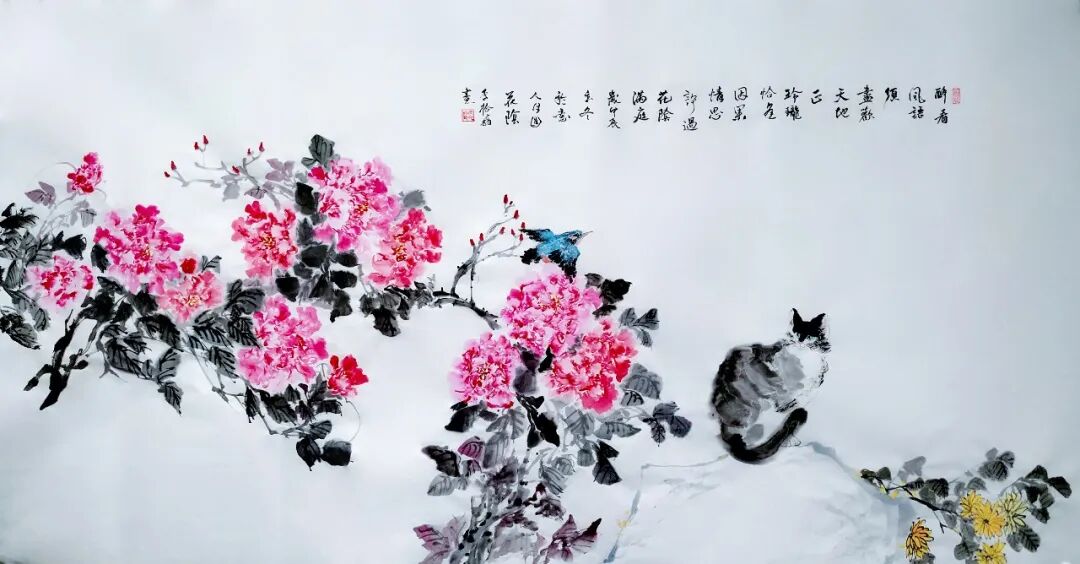 在花鸟创作上,李拾磊同样坚持内敛而端庄的格调,以《忆王孙》系列、《忆秦娥》系列、《渔歌子》系列、《梦江南》系列《小桃红》系列等与《苍梧谣·芙渠》为代表,远离浓艳浮华,专注于自然本真之美。作品多以牡丹为主体,辅以禽鸟兽蠓,姿态自然,气韵生动,不刻意雕琢,不强行造势。花朵舒展而不娇媚,禽鸟灵动而不喧闹,枝叶穿插错落,自成意趣。笔墨收放自如,设色温润含蓄,于精微处见功底,于素雅中见格调,将传统花鸟画的吉祥意蕴与文人审美相融,尽显笔墨涵养与艺术格调。