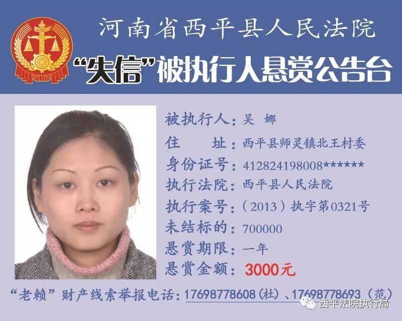 本院在执行案件过程中,因下列被执行人不履行生效法律文书所确定的义务、故意隐匿财产躲避执行,特对以下被执行人进行悬赏执行,并承诺有关人员如提供真实有效的被执行人下落并协助抓获, 向其支付赏金3000元。