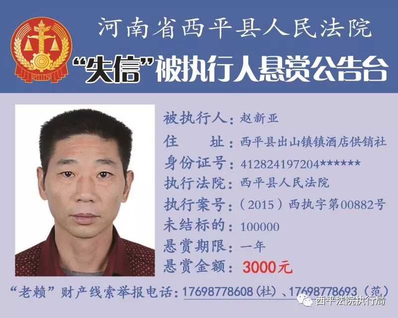 本院在执行案件过程中,因下列被执行人不履行生效法律文书所确定的义务、故意隐匿财产躲避执行,特对以下被执行人进行悬赏执行,并承诺有关人员如提供真实有效的被执行人下落并协助抓获, 向其支付赏金3000元。