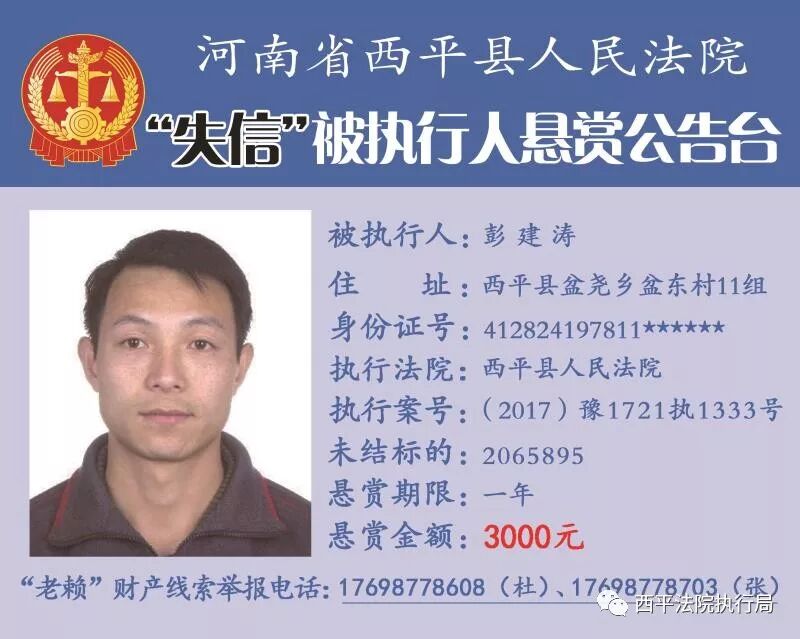 本院在执行案件过程中,因下列被执行人不履行生效法律文书所确定的义务、故意隐匿财产躲避执行,特对以下被执行人进行悬赏执行,并承诺有关人员如提供真实有效的被执行人下落并协助抓获, 向其支付赏金3000元。