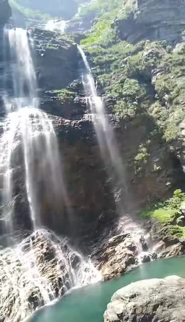 虽是不到雨季,来自大月山的水量还是相当充沛的,瀑布从几百米的悬崖峭壁分三级跳下,第一级距离远些,遥观瀑布如烟如雾,飘渺虚幻,似一位仙女身披白色鸿衣羽裳,轻舒广袖,衣袂飘飘蹁跹飞舞而至,掠过五老峰背,妩媚袅娜的飘落第一大盘石。二级叠瀑布看的真切一些了,只见峭壁悬挂水晶珠帘,银光闪闪,晶莹剔透,飞珠溅玉,好似皎洁月光穿越树荫,化作碎银倾泻在二级大盘石间,奏响一曲欢快美妙的旋律。三叠便是眼前的悬崖瀑布的,仰望崖壁,有大小两股水柱从天而降,好似双龙兄弟携手并肩,呼啸着奔腾而下,威武勇猛,气势磅礴,势不可挡,义无反顾的跳进龙潭,直到粉身碎骨,化作白莲,融入湖水,成就一段荡气回肠英雄气概。庐山瀑布之奇观,有太白诗为证,