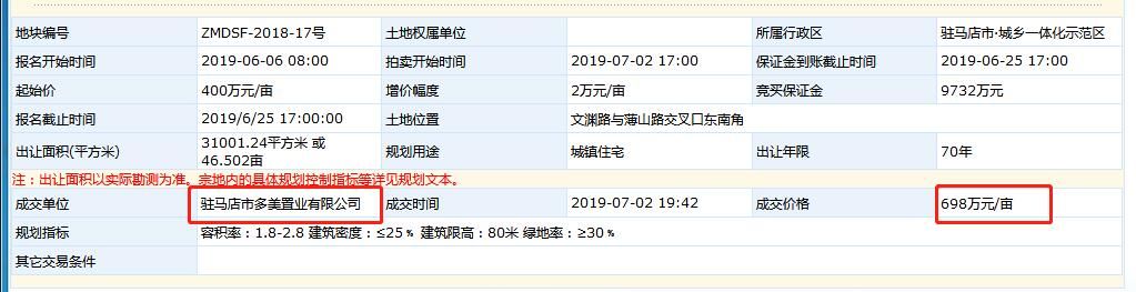 宗地一:ZMDSF-2018-17号地块,驻马店市多美置业有限公司(同信地产)以3739元/㎡的住宅楼面价竞得,总价3.24亿元,单价698万/亩。