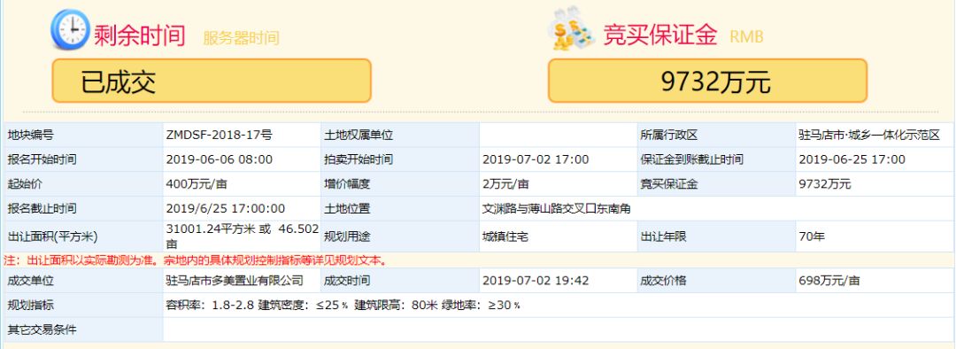 2019年7月2日,驻马店市地产交易中心传来新地王ZMDSF-2018-17号宗地的拍卖消息。