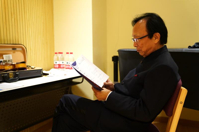 17日晚,刘育熙在演出前阅读节目单。