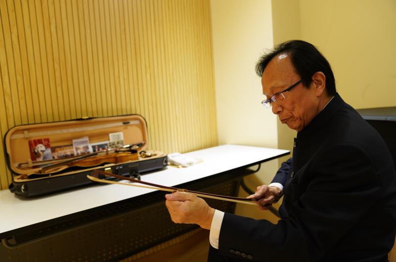 17日晚,刘育熙在演出前护理琴弦。