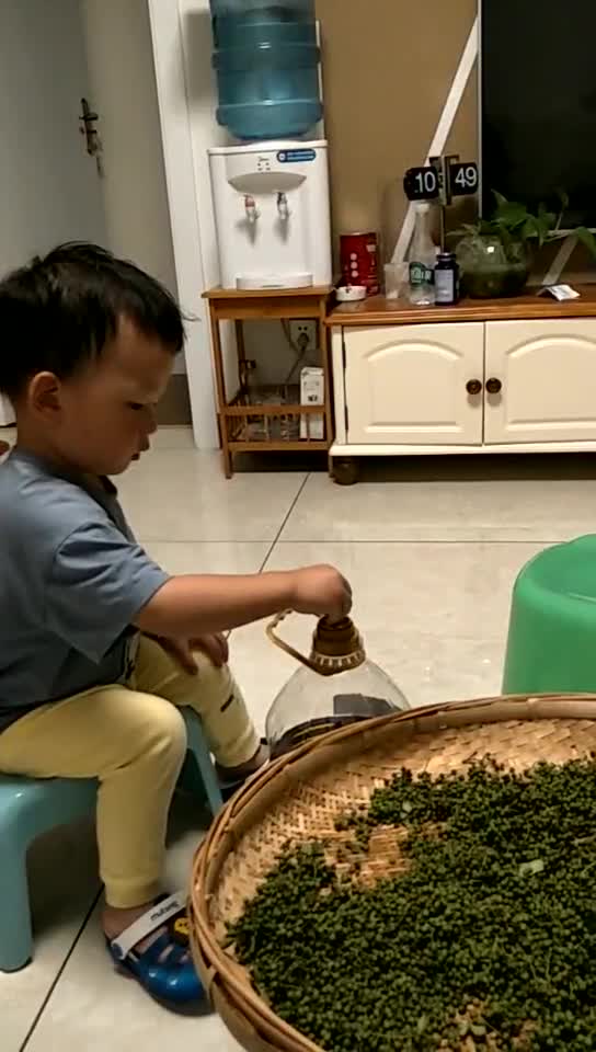 二岁的宝宝泡花椒油,不小心弄洒,自己拾起来