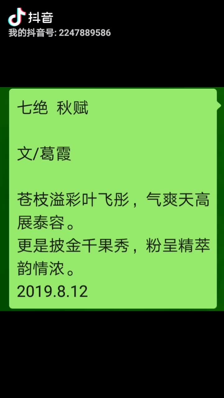 \ 七绝 秋赋 文/葛霞 苍枝溢彩叶飞彤,气爽天高展泰容。 更是披金千果秀,粉呈精萃韵情浓。 2019.8.12